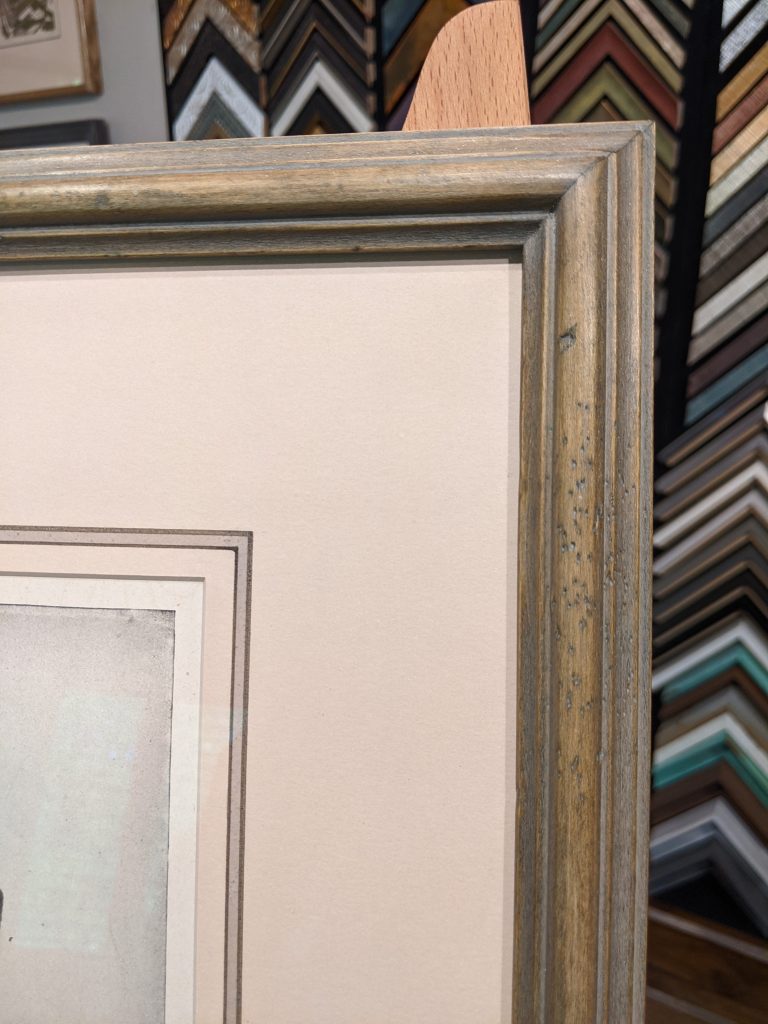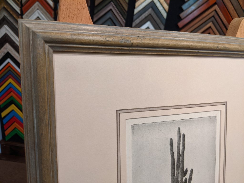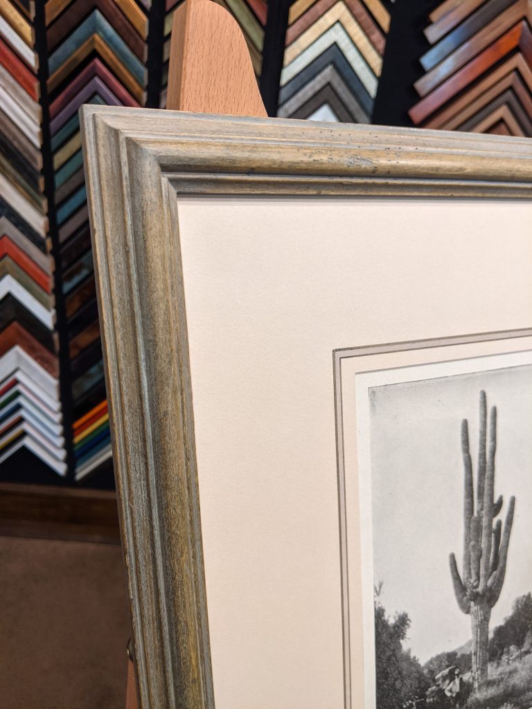 It’s framed in an antiqued basswood 1 1/4″ vintage reverse profile with a bottom weighted Antique Tan rag mat decorated with a gray watercolor panel surrounded by two dark gray French lines.